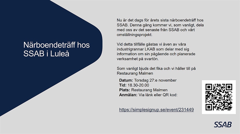 Närboendeträff 27 nov kl 18.30-20.00! SSAB + LKAB. Anmäl: länk alt QR-kod